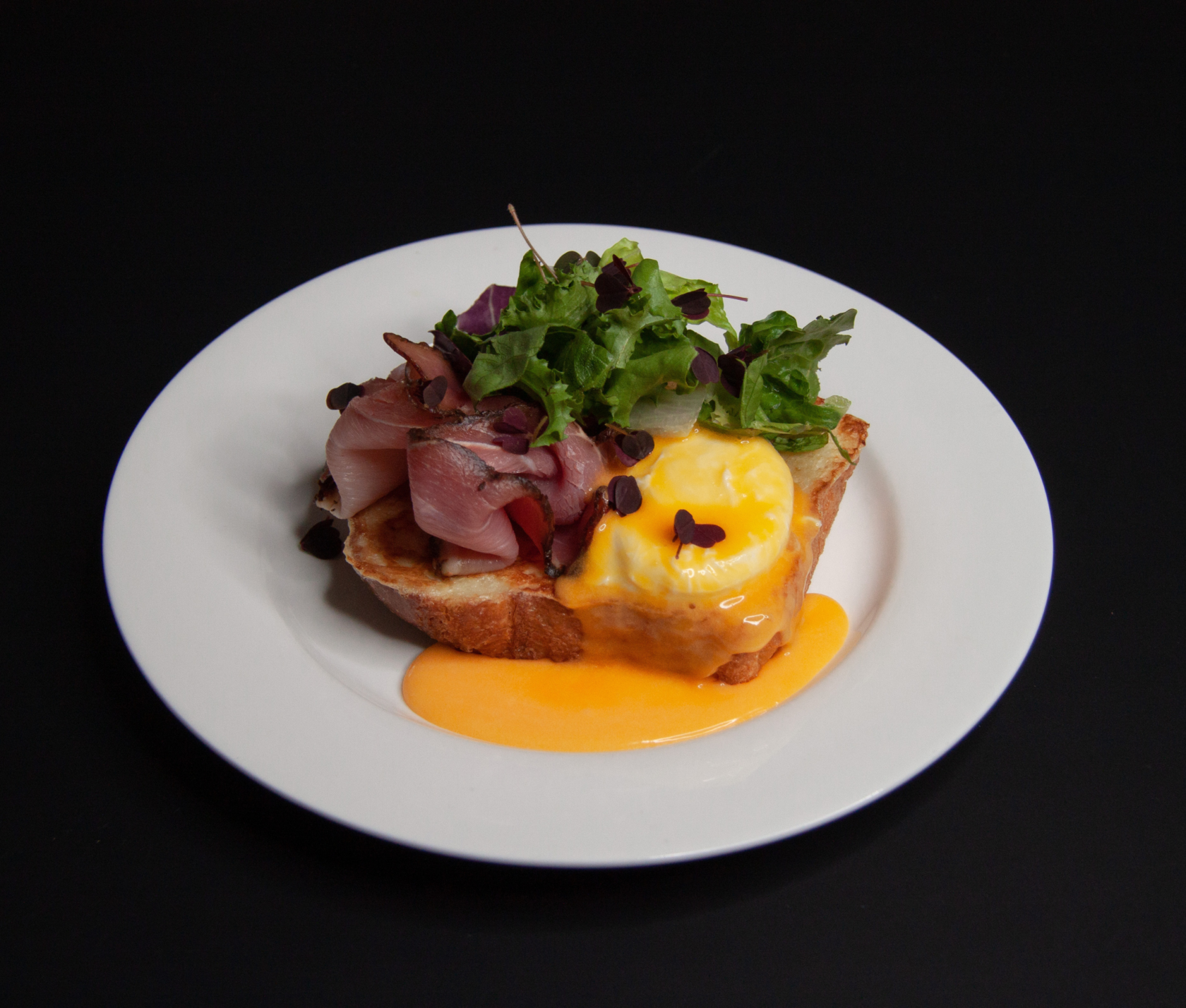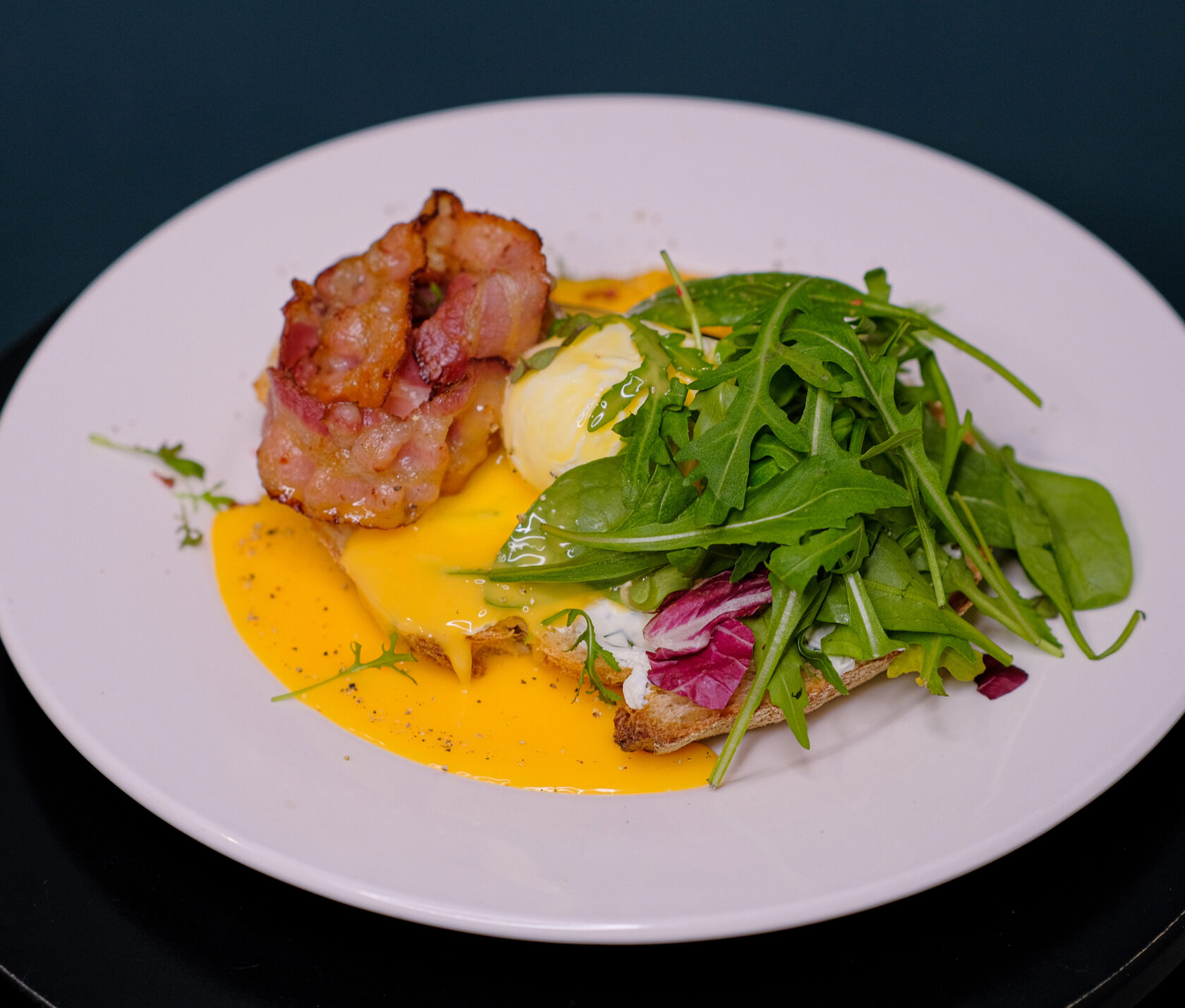 Ремесленный хлеб, творожный сыр с зеленью, бекон, яйцо пашот, соус голландез и сезонная зелень
