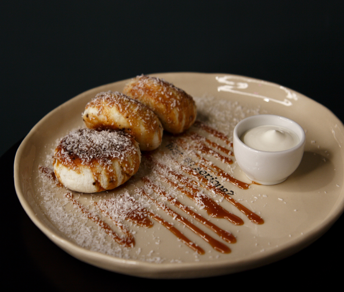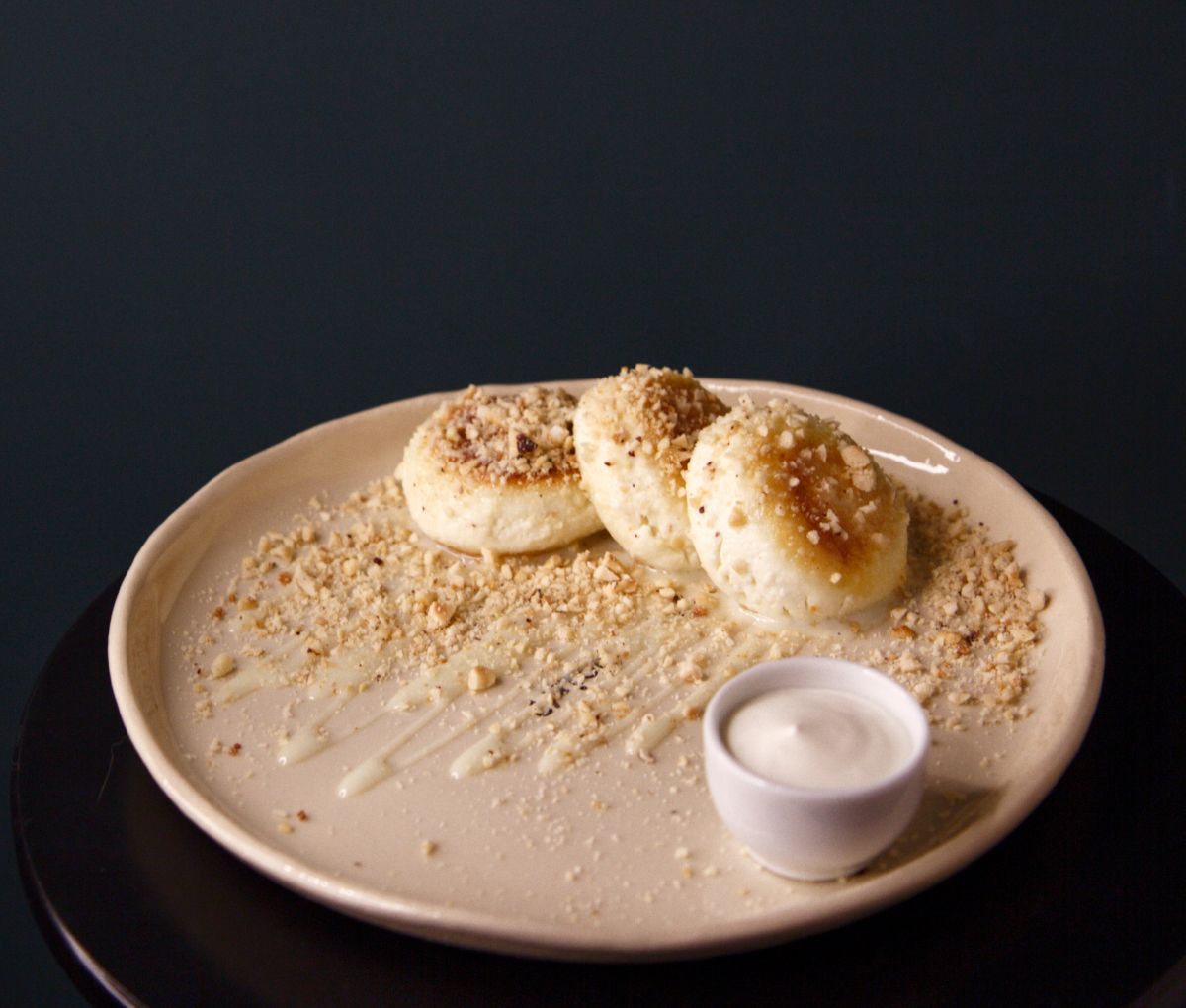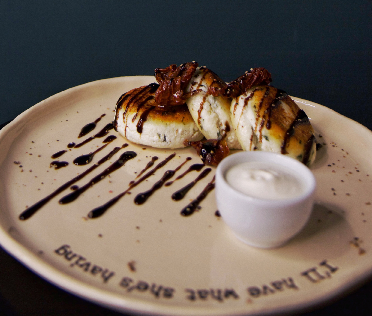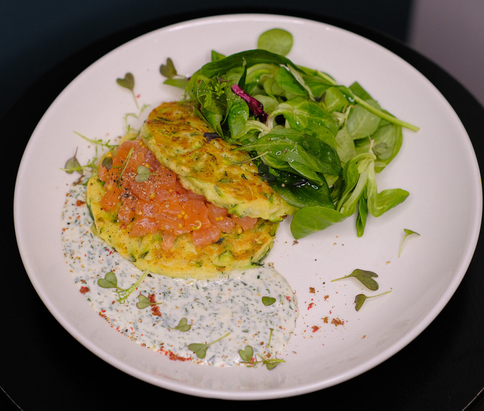 Драники из цукини с тартаром из лосося, сезонной зеленью и соусом тартар