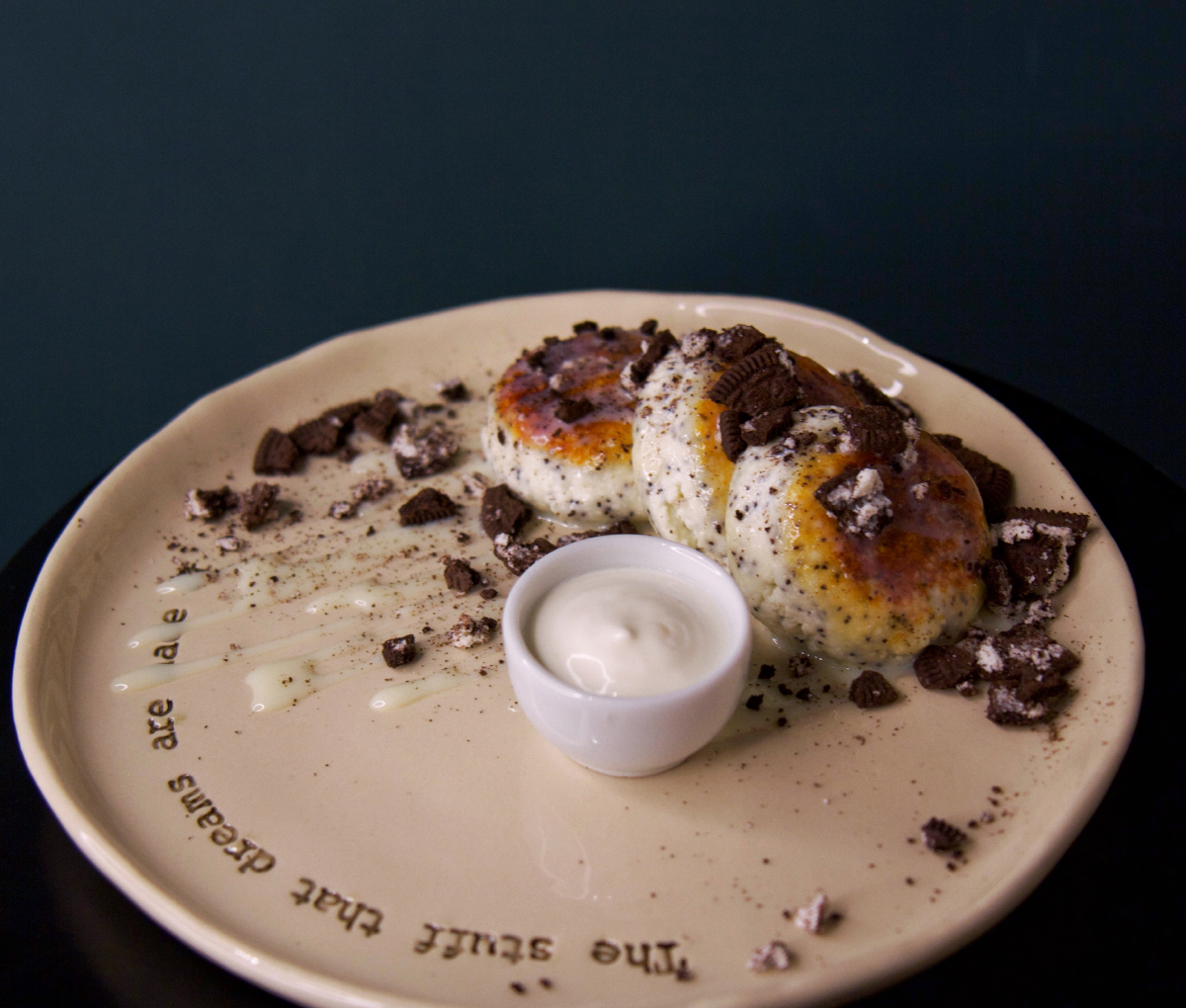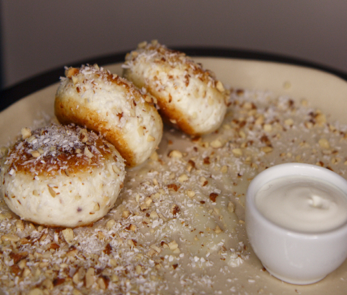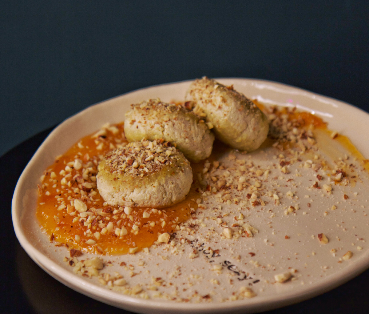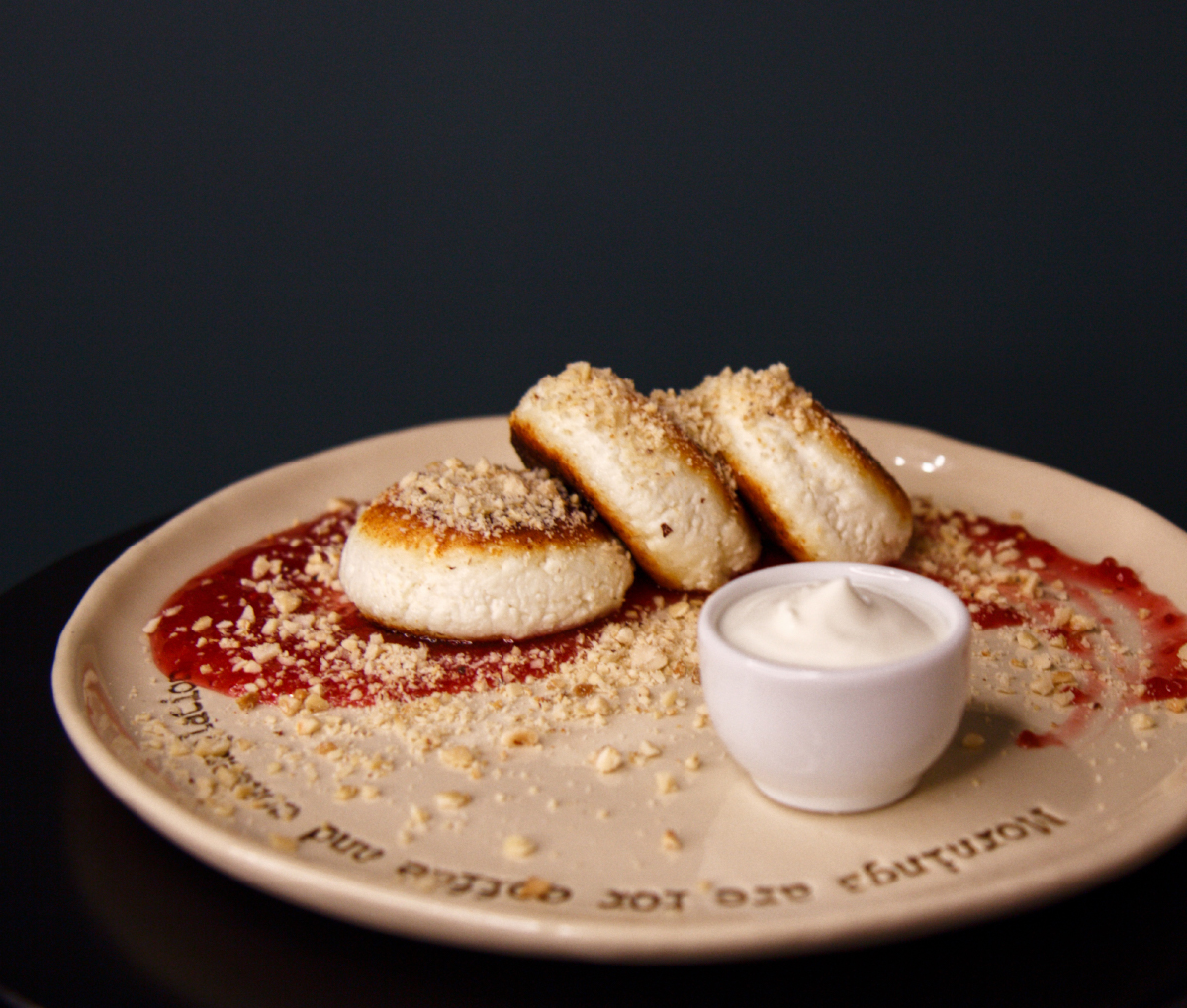 Драники из цукини с тартаром из лосося, сезонной зеленью и соусом тартар