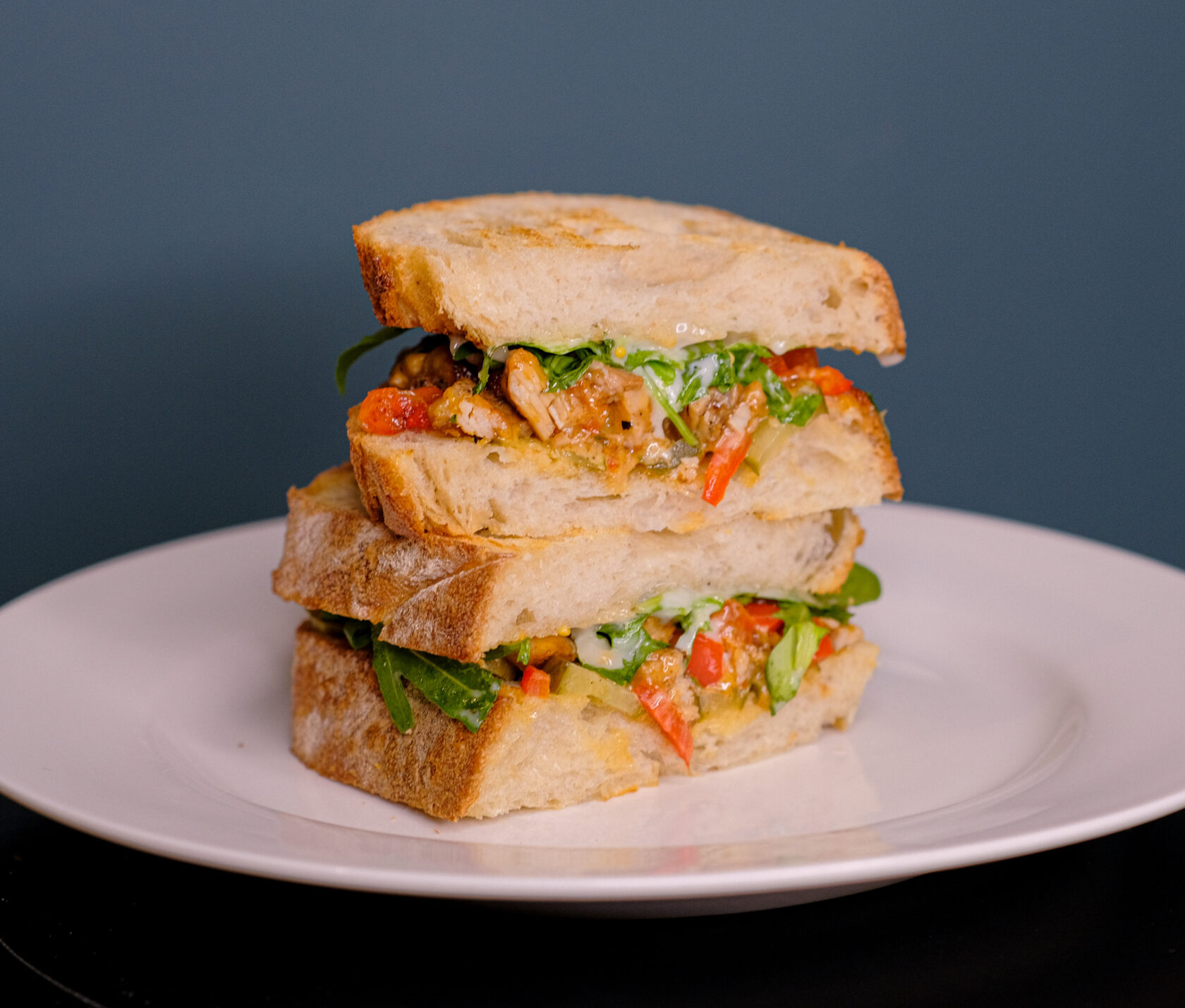 Ремесленный хлеб, курица, домашний майонез, сыр Чеддер, соленый огурец, болгарский перец и сезонная зелень
