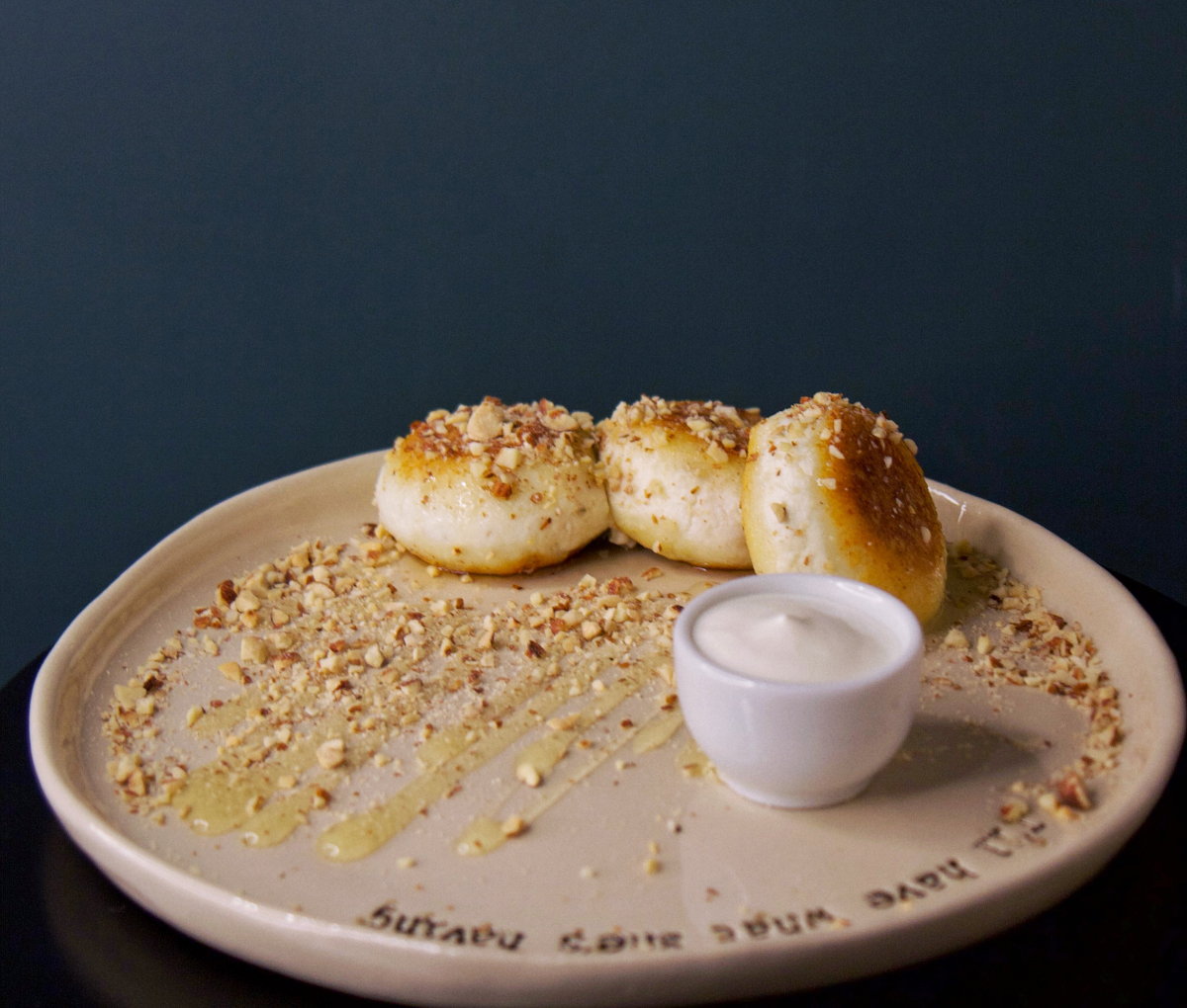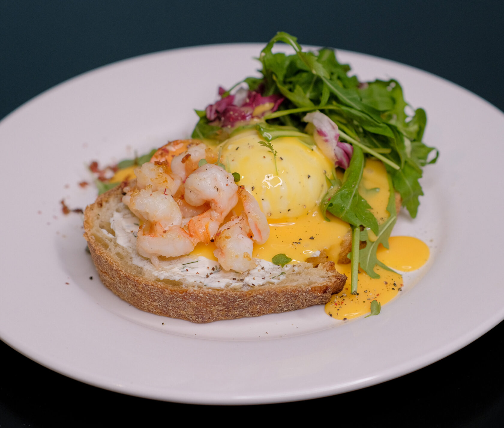 Ремесленный хлеб, творожный сыр с зеленью, креветки, яйцо пашот, соус голландез и сезонная зелень