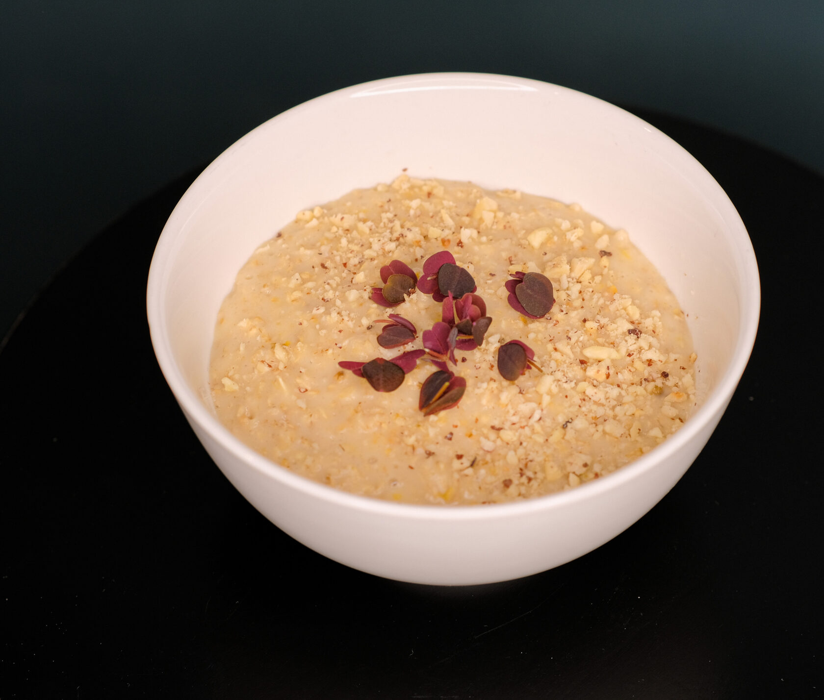 Овсяная каша на молоке с джемом на ваш выбор (абрикосовый/малиновый) и дроблённым фундуком