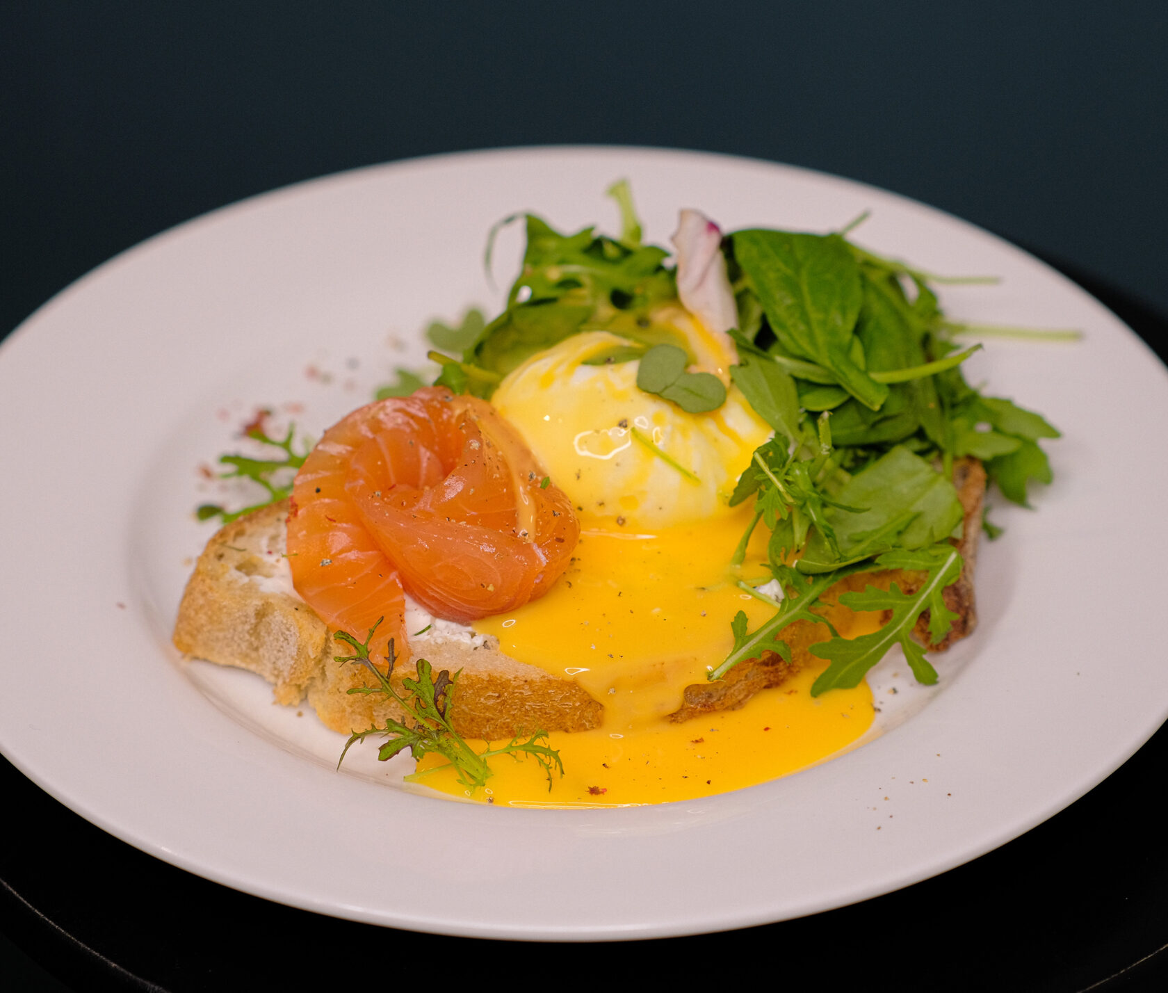 Ремесленный хлеб, творожный сыр с зеленью, лосось, яйцо пашот, соус голландез и сезонная зелень