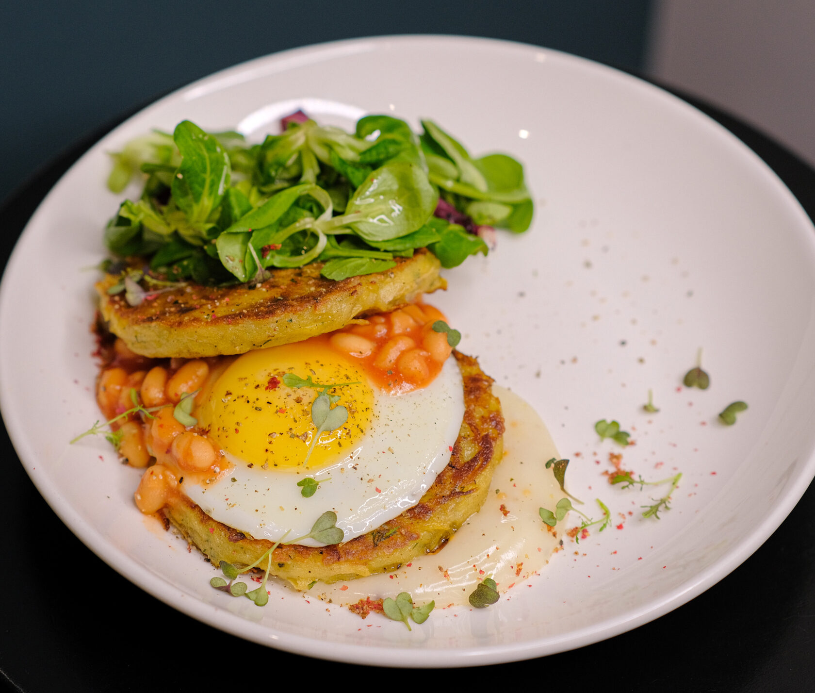 Картофельные драники, фасоль в томатном соусе, глазунья, домашний майонез и сезонная зелень