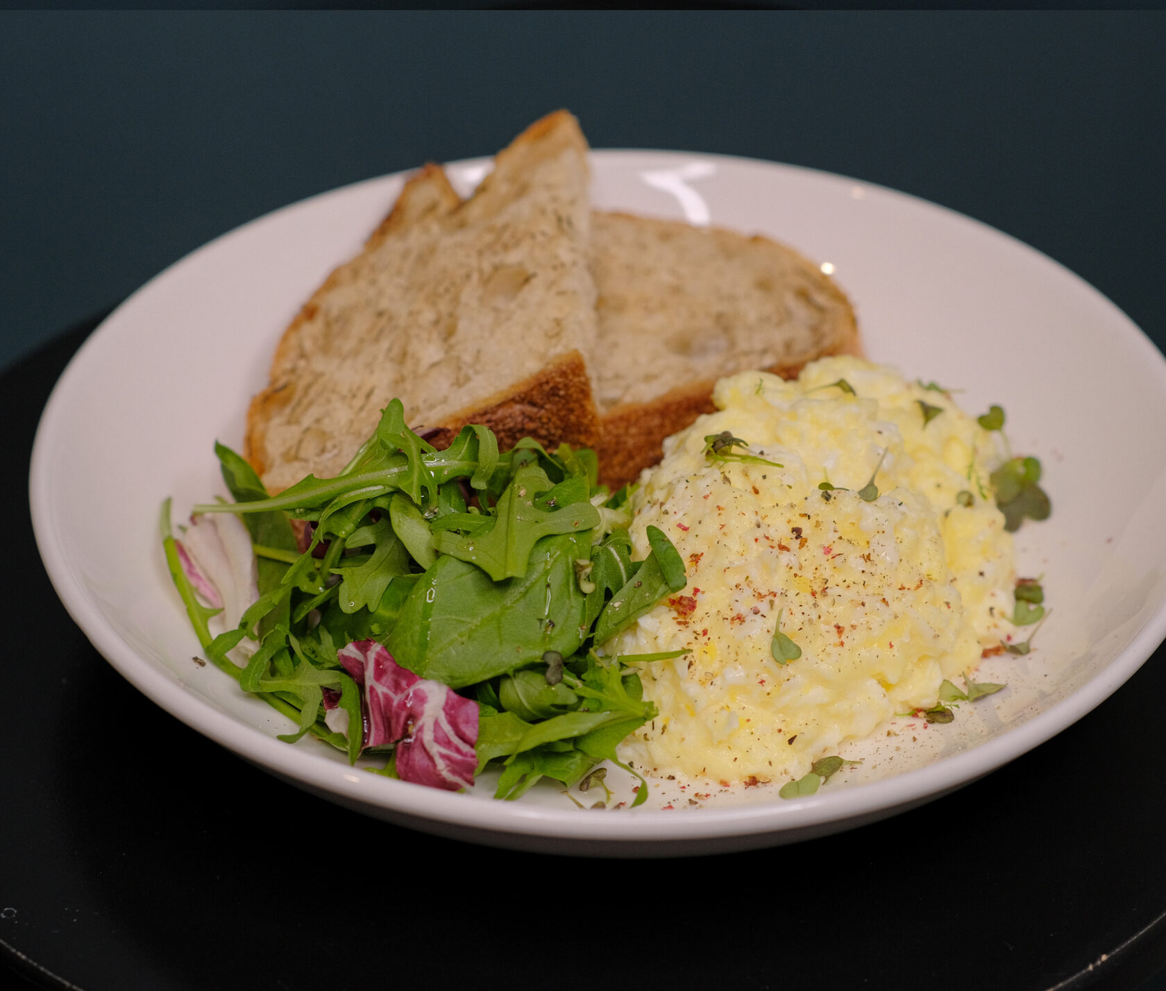 Мы можем приготовить глазунью или скрэмбл, на ваш выбор. Подаётся с ремесленным хлебом и сезонной зеленью